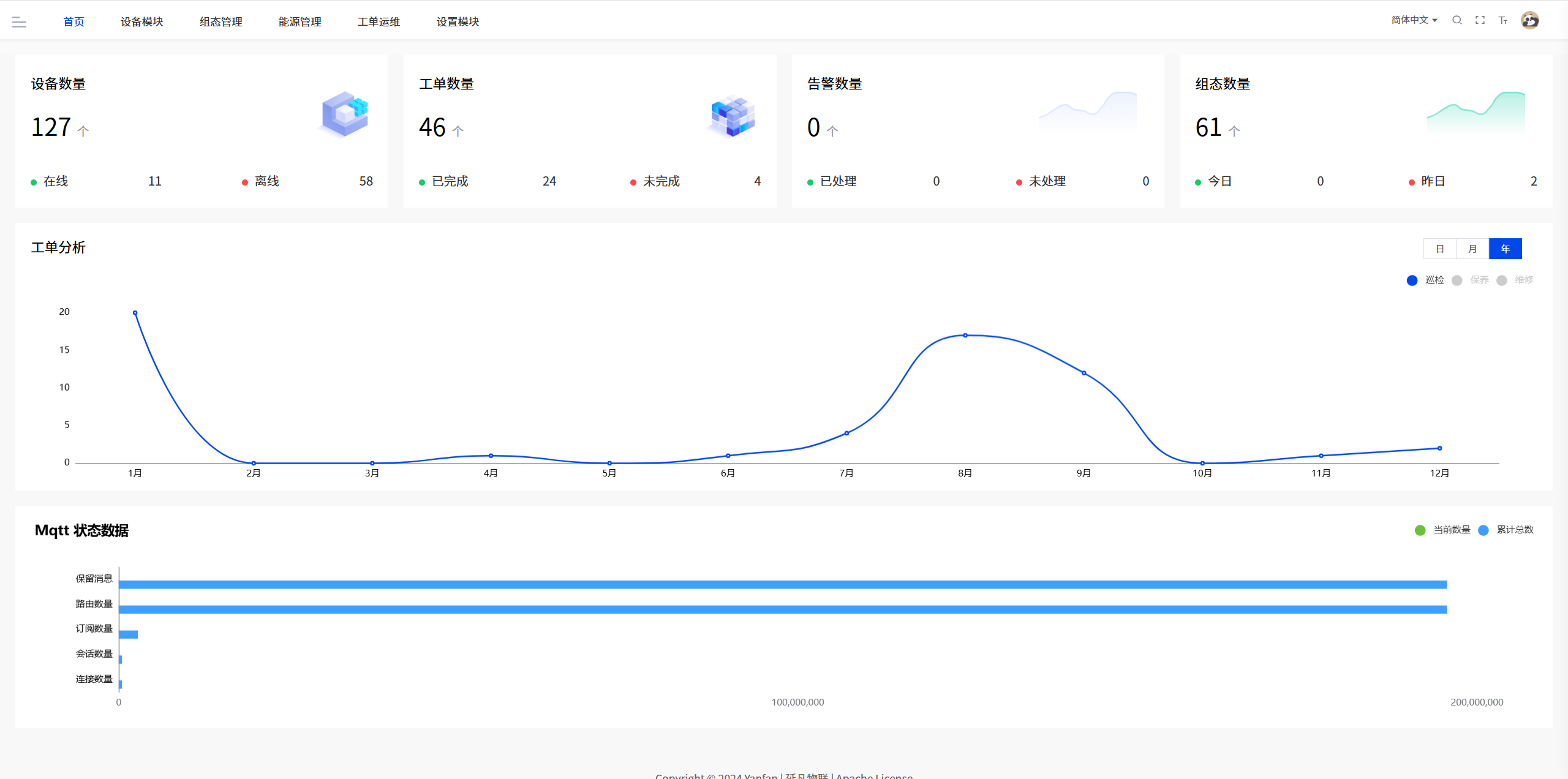 延凡科技物联网平台支持设备接入与联动控制,实现即时告警;提供自定义组态图表大屏,直观展示系统状态;全面监测水、电、气、冷、热等能耗数据,并进行深入分析;同时,平台还涵盖巡检、保养、维修工单等运维管理功能,助力企业高效运维。